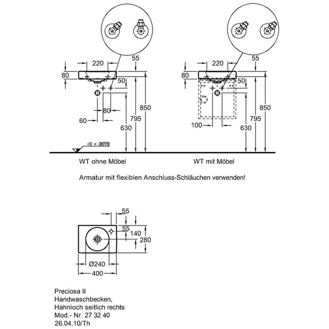 Geberit handrinse basin Preciosa II: B=40cm, T=28cm, Tap hole=right, Overflow=without, white